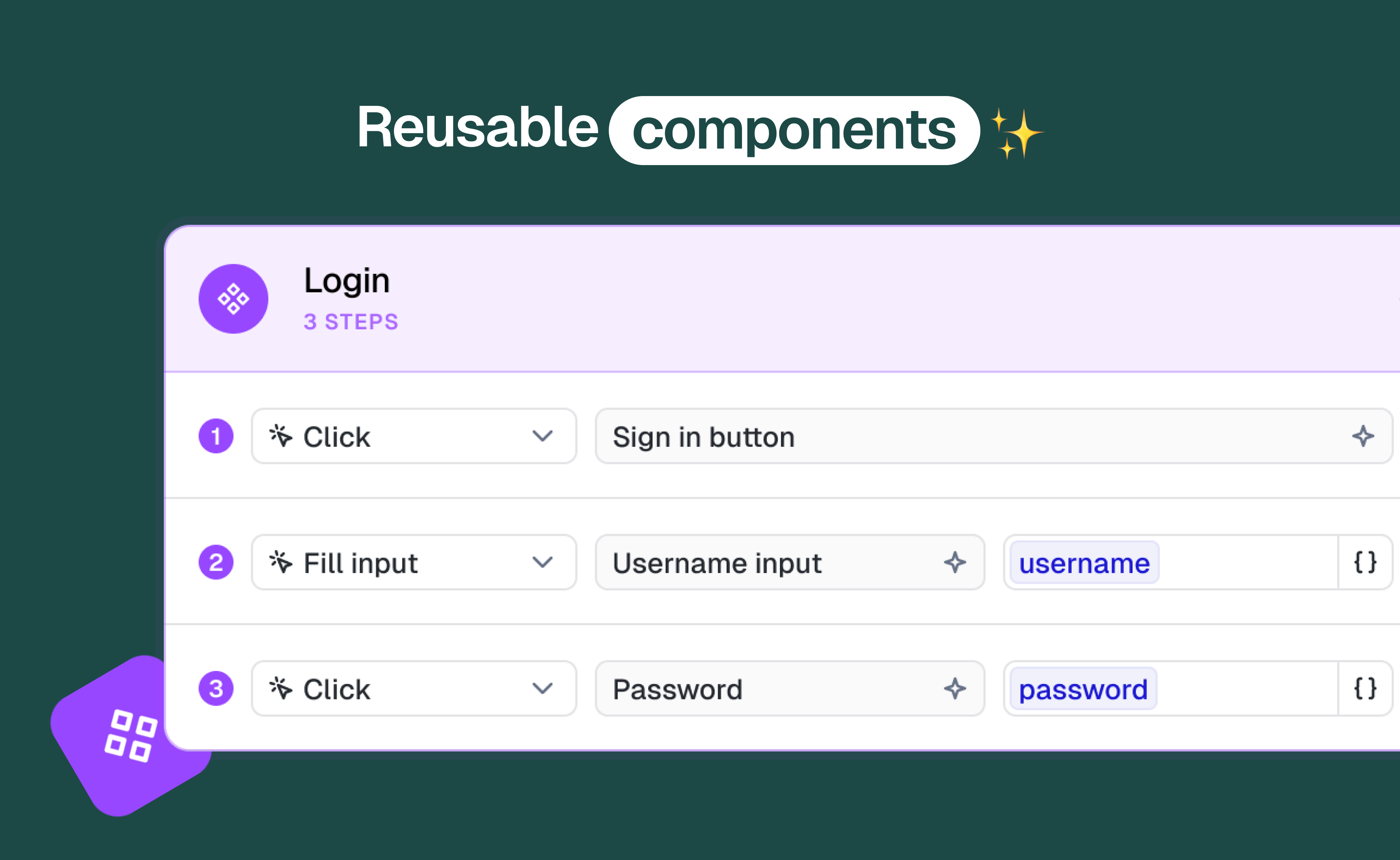 Les Reusable Components sont des groupes d’étapes que vous créez une seule fois et réutilisez partout (login, logout, création d’utilisateur, parcours de setup, etc.). Mettez-les à jour une fois, et tous les tests qui les utilisent restent automatiquement synchronisés.
